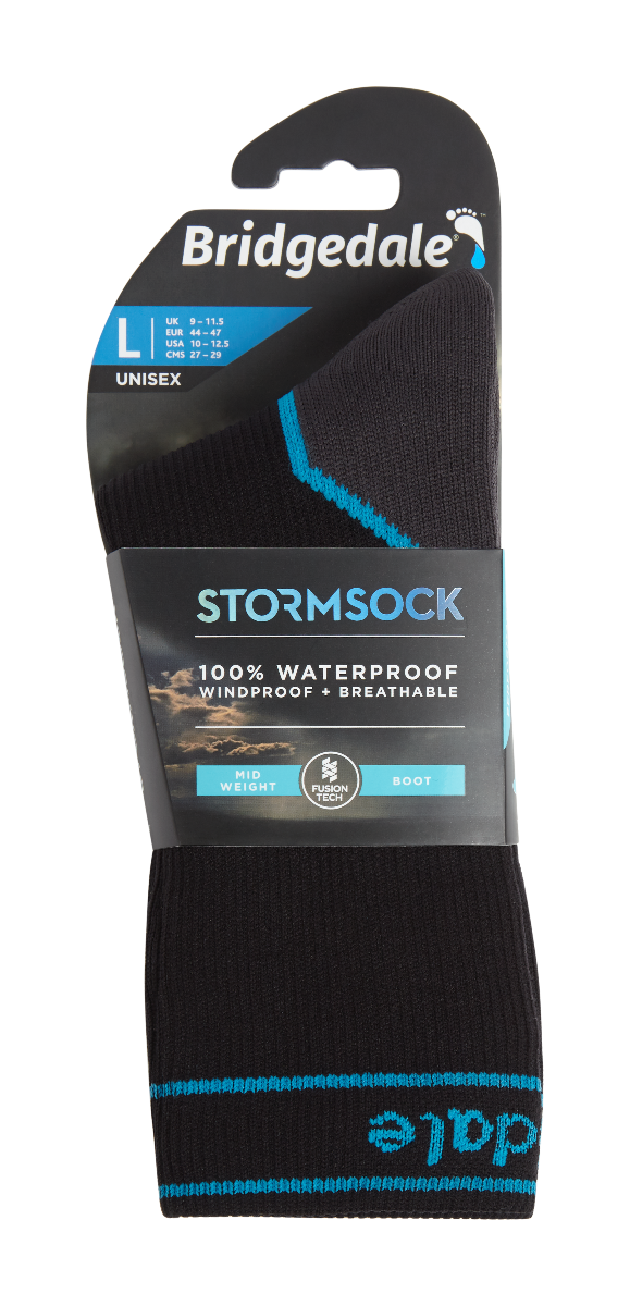 Bridgedale Stormsock Midweight Boot - 100%  водонепроникна шкарпетка, з щільною, еластичною підкладкою в районі пятки та щиколотки, крутий варіант для активного відпочинку, де важливий баланс дихаючих та теплоізоляційних властивостей. Шкарпетки чудово підійють до трекінгу чи хайкінгу у вологій місцевості.
