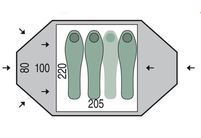Спеціальна консольна дуга збільшує об'єм тамбура, а за рахунок пересічних дуг зі скловолокна куполоподібна форма намету має відмінні характеристики вітростійкості. Два тамбура полегшують доступ в намет, а антимоскітна сітка, якою продубльовані входи в спальне відділення, і вентиляційні клапани спеціальної форми забезпечують ідеальну вентиляцію.